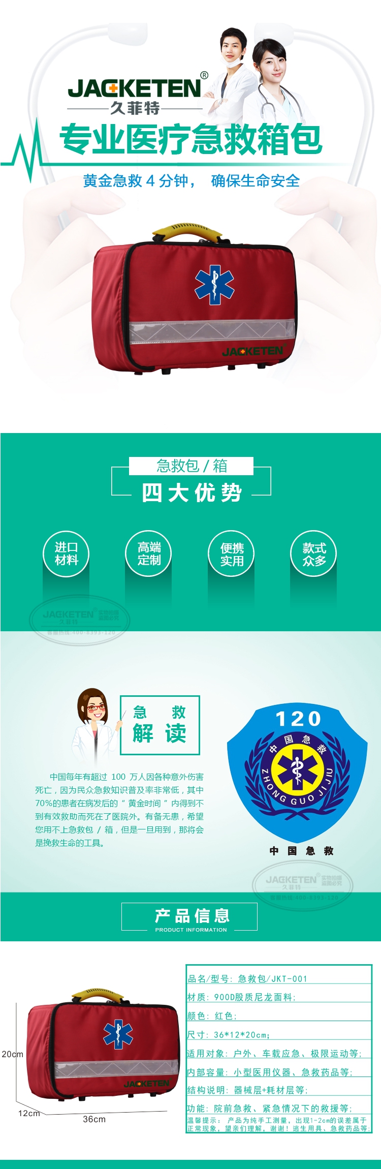 品名/貨號(hào):急救包/JKT-001;材質(zhì):900D股質(zhì)尼龍面料;顏色:紅色;尺寸:36*12*20cm;適用對(duì)象:戶(hù)外、車(chē)在應(yīng)急、極限運(yùn)動(dòng)等;內(nèi)部容量:小型醫(yī)用儀器、急救藥品等;結(jié)構(gòu)說(shuō)明:器械層+耗材層;功能:院前急救、緊急情況下的救援等