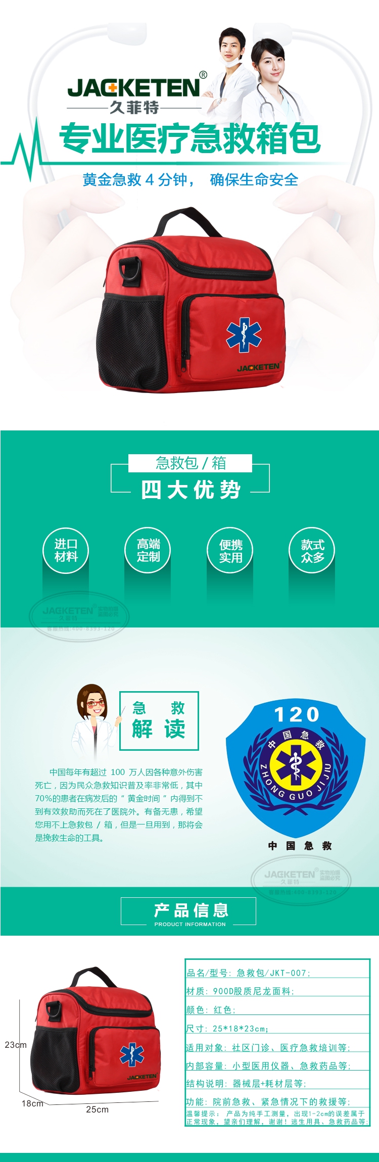品名/貨號:急救包/JKT-007;材質(zhì):900D股質(zhì)尼龍面料;顏色:紅色;尺寸:25*18*23cm;適用對象:社區(qū)門診、醫(yī)療急救培訓(xùn)等;內(nèi)部容量:小型醫(yī)用儀器、急救藥品等;結(jié)構(gòu)說明:器械層+耗材層;功能:院前急救、緊急情況下的救援等