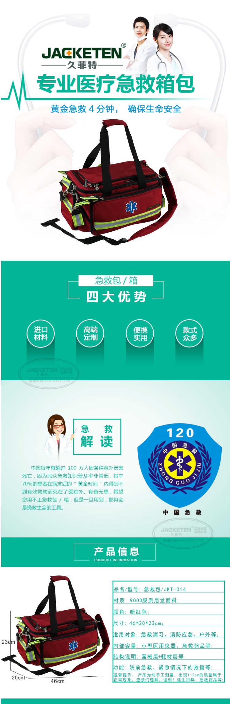 品名/貨號(hào):急救包/JKT-014;材質(zhì):900D股質(zhì)尼龍面料;顏色:暗紅色;尺寸:46*20*23cm;適用對(duì)象:急救演習(xí)、消防應(yīng)急、戶外等;內(nèi)部容量:小型醫(yī)用儀器、急救藥品等;結(jié)構(gòu)說明:器械層+耗材層;功能:院前急救、緊急情況下的救援等